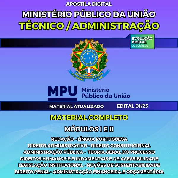 Nossa apostila para o concurso MPU - Técnico Administração foi desenvolvida pensando exatamente nisso: oferecer um conteúdo direcionado, atualizado e completamente alinhado ao edital. Com este material, você terá acesso a um conteúdo de qualidade, focado no que realmente importa para a prova, permitindo que seu estudo seja mais eficiente e produtivo.