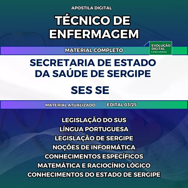 Nossa apostila para o concurso SES SE - Técnico de Enfermagem foi desenvolvida pensando exatamente nisso: oferecer um conteúdo direcionado, atualizado e completamente alinhado ao edital. Com este material, você terá acesso a uma apostila de qualidade, focada no que realmente importa para a prova, permitindo que seu estudo seja mais eficiente e produtivo.
