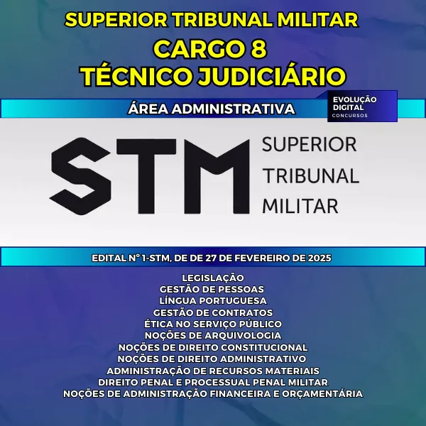 Com conteúdo direcionado, atualizado e completamente alinhado ao edital, este material te dará a base necessária para você fazer uma prova tranquila e segura. Tornando seu estudo mais eficaz e produtivo, focado no que realmente importa e te ajudando a conquistar uma vaga como Técnico Judiciário do STM.